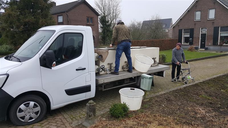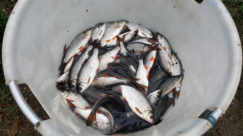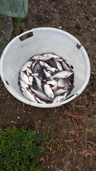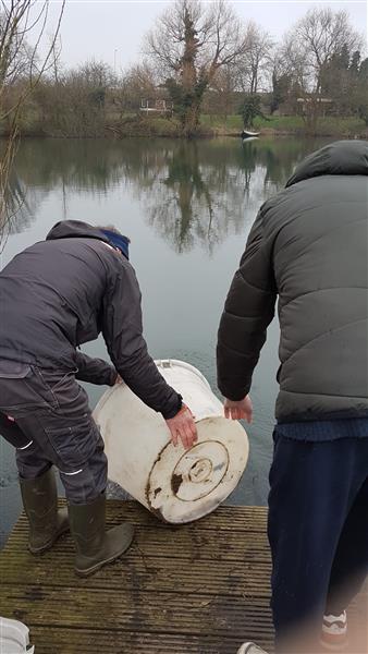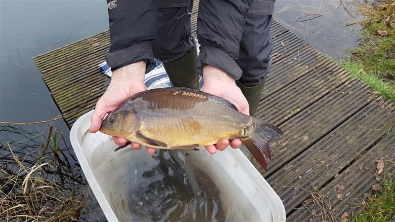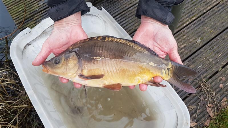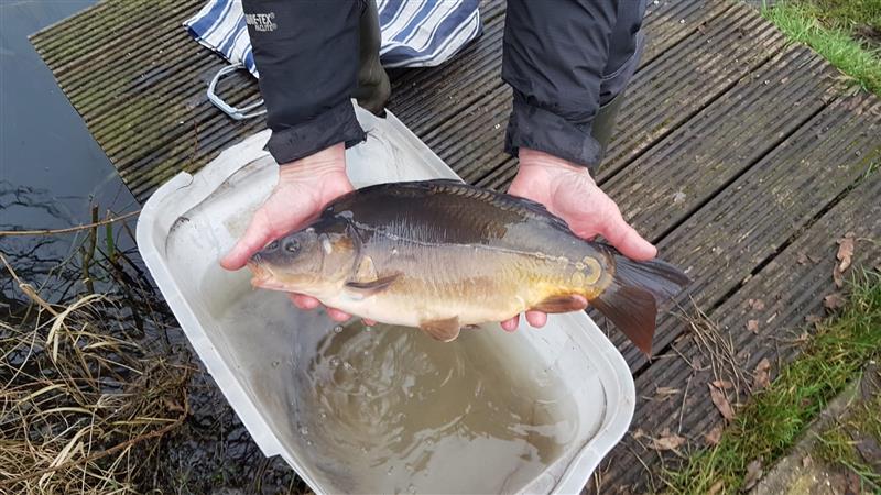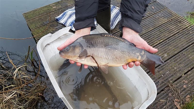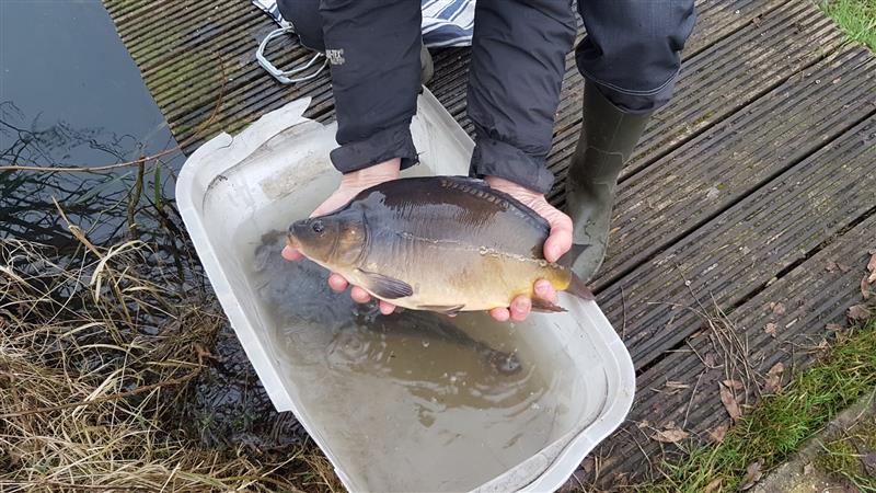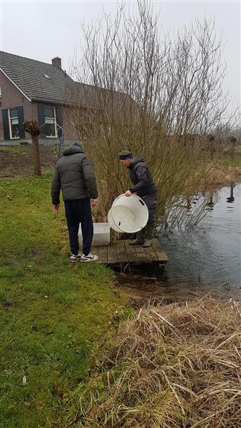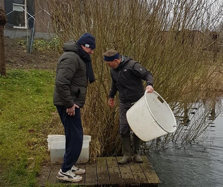 Het uitzetten van pootvis in de kolk. Er zijn ook vijf nieuwe spiegelkarpers uitgezet.