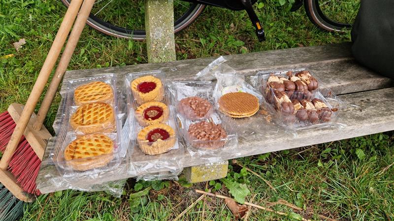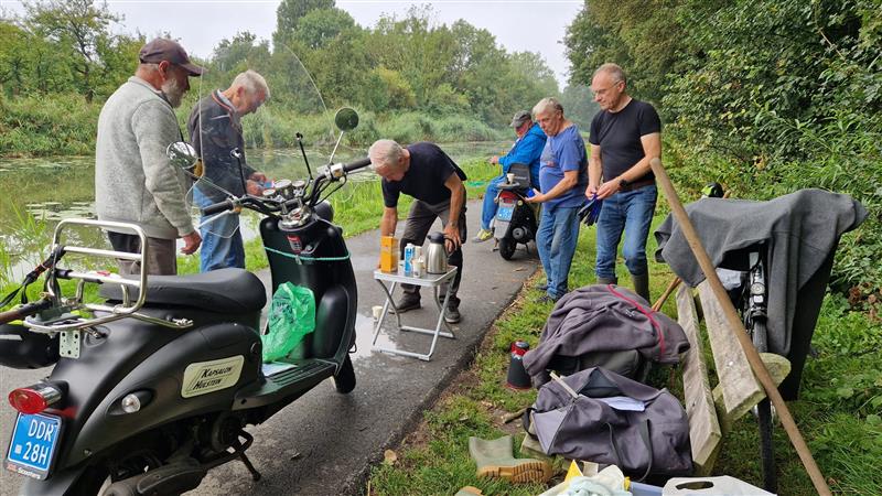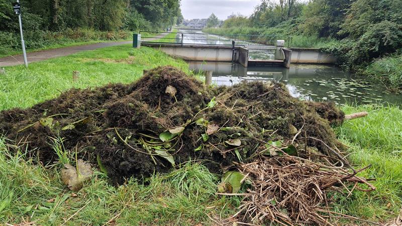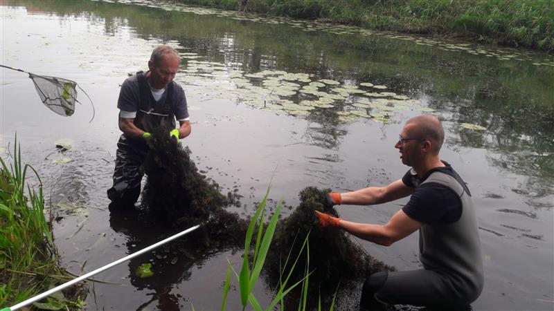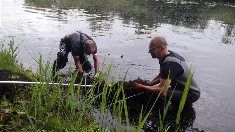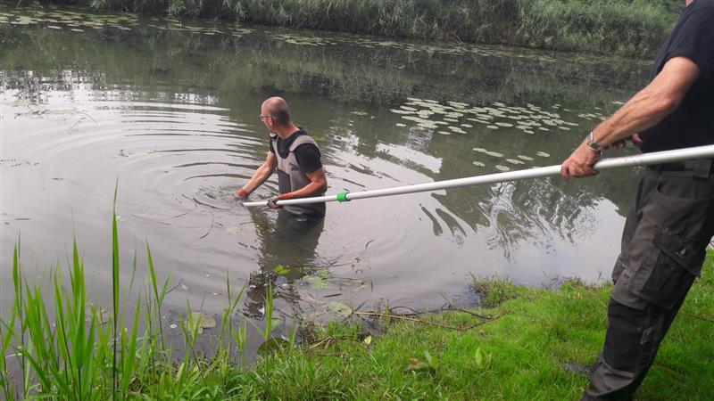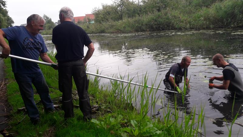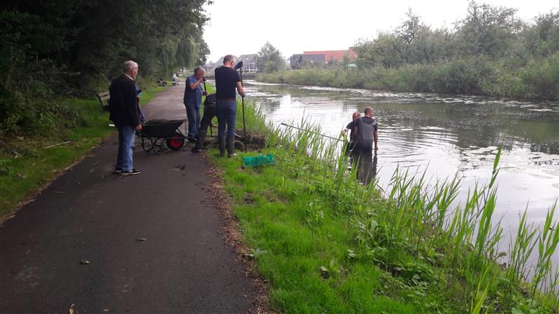 Het schoonmaken van visplaatsen in de gracht met de nieuwe hark.